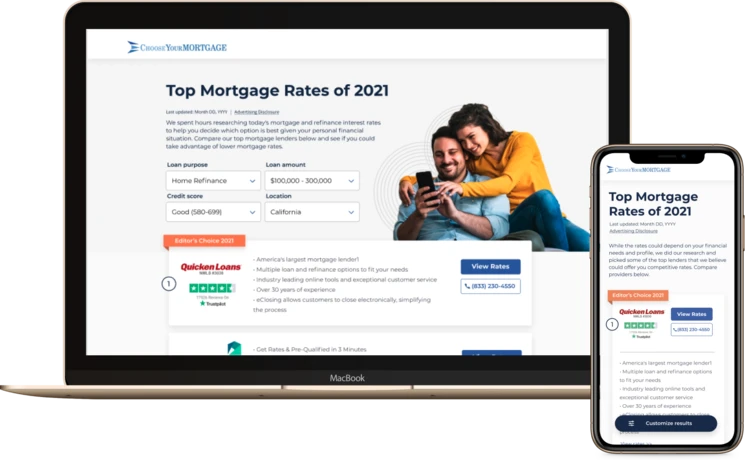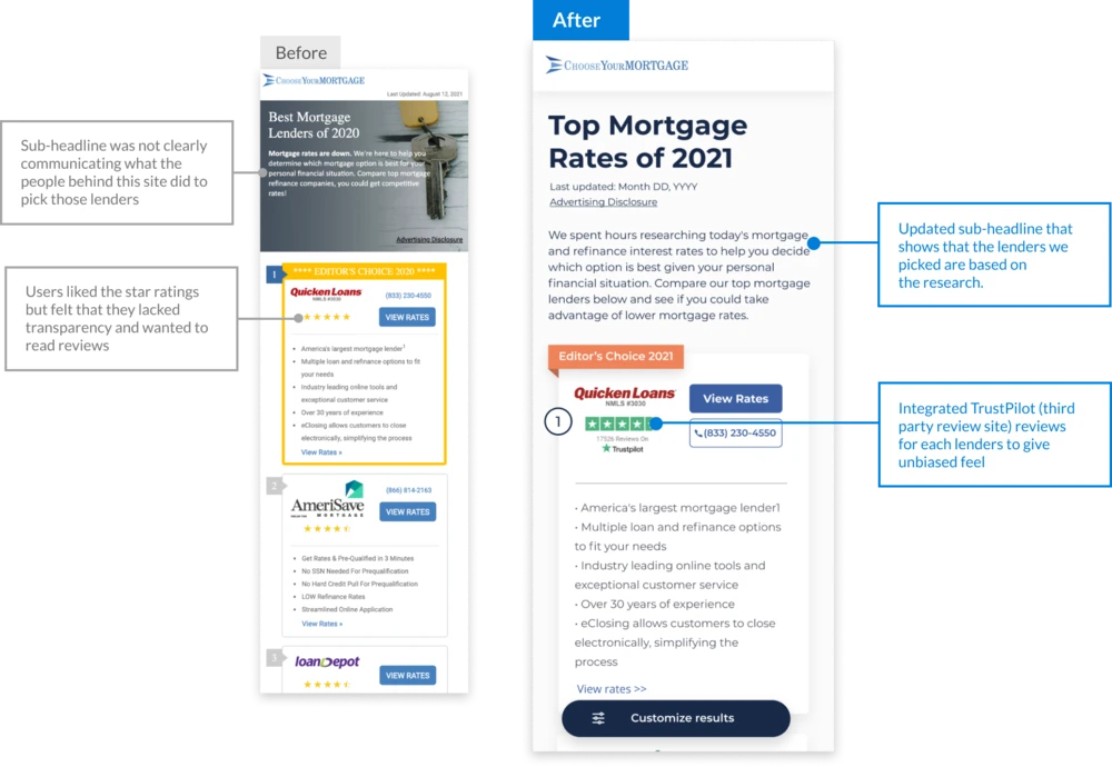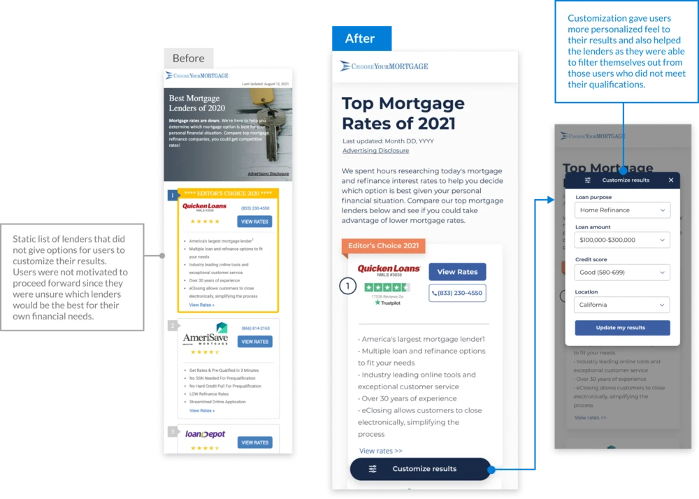 Core Digital Media (acquired by Rocket Mortgage) built ChooseYourMortgage.com, where users can search the best options from a list of lenders. I oversaw user interviews, usability tests, stakeholder workshop facilitations, UX design and AB testing.